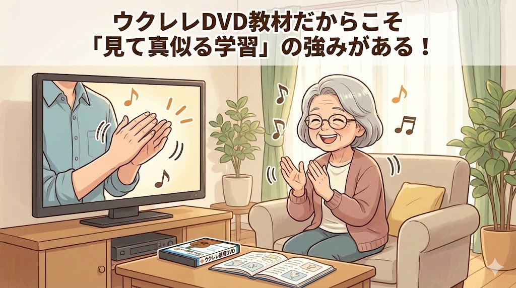 ウクレレDVD教材は、手元の動きを視覚で理解でき、順番通りに練習できるため、ウクレレを始める初心者にとって最適な学習方法です。特に50〜60代の方にとって、動画で「見て真似る」形式は合っているケースが多く、短期間で上達を実感できます。